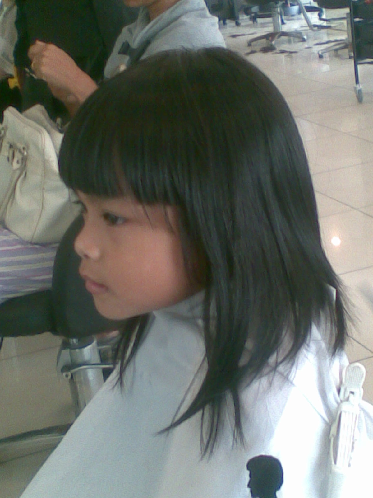 Dari 1 hari ke 1 hari mama dok lah janji ngn kakak nk bwk dia g saloon cut her hair...actually kakak br gunting rmbut b4 she start her class...hurmm..mama wat rmbut style bob...then rambut dpn dia tu cepat nOo panjangnye...so mama gunting sendiri lah ala2 ceopatra gtu...hehehe...last2 yg ADO !!!so..last saturday mama bwk kakak g saloon gak...saloon peberet mama n papa...Hairazone in kajang town..!! ... sambil nunggu turn kakak..mama dok belek2 majalah rambut tok wat rujukn lah...dia pon nyebok gak nk cari style rambut dia...hurmm..balik2 rambut senget... balik2 rambut senget..xde nye mama nk ikut..mama cari style rambut potongan biase tapi rambut dpn tu mama nk kepitkn ngn sepit je nnt...nasib lah kedai accessories rambut brdepan je ngn saloon...haha..mama pon merembat lah dlm 6 kepit rambut tok kakak...itu pon 1 dh ileekkk..:P