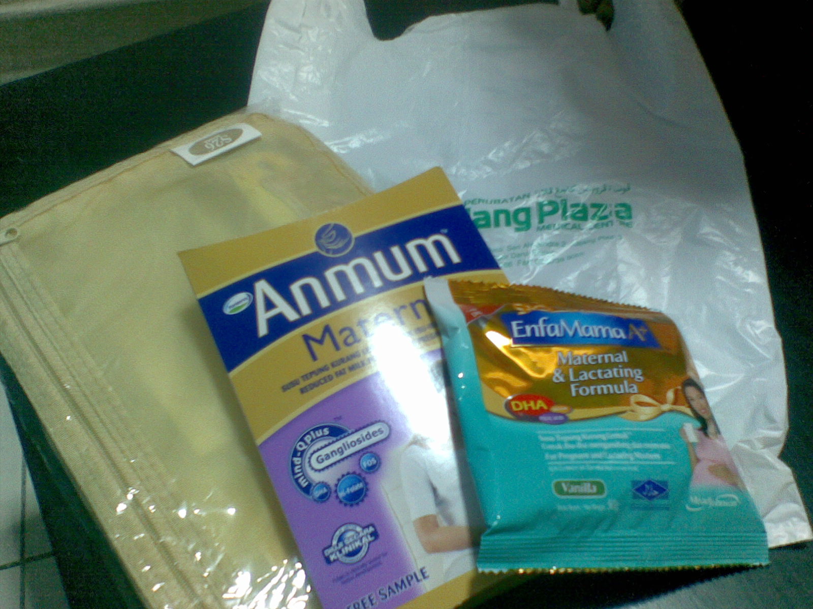 smalam mama g checkup kt KPMC..kena ngan doc Jamil lg...dh 2x nih...mama bkn x suker dia..cm mama agak kurang selesa coz dia lelaki...:P...tp doc Jamil ni adalah pakar dalam bidang O&G...n dia ni seyes orangnye tau...tp klu kena borak dia...insyaallah..okeh..cm mama 'bengang' coz dh 2x checkup ngn dia...2x dia x print scan bb ...huhu sedey mama...!! smalam dh pesan kt dia soh print..dia angguk..pastu dia trlupe kot..(ayat nyedapkan hati lah ni)..hua3...tp smalam mama sdikit gumbira lah coz dpt berite best n ms dok tggu nk byr bil tu...asst dia bg pesent kat mama...dlm bungkusan 2 de 3 sample susu materna..brand wyegt (btl ke x erk???)...brand Enfamama n ANMUM..ANMUM ni mama mmg minum..since ngandungkn kakak lagi...cumer dia kasi 2 perisa..Vanilla n coklat..smalam mama try coklat..sedap gak..b4 ni mmg mama minum Vanilla je...^_^